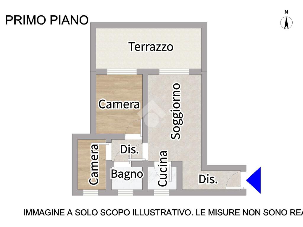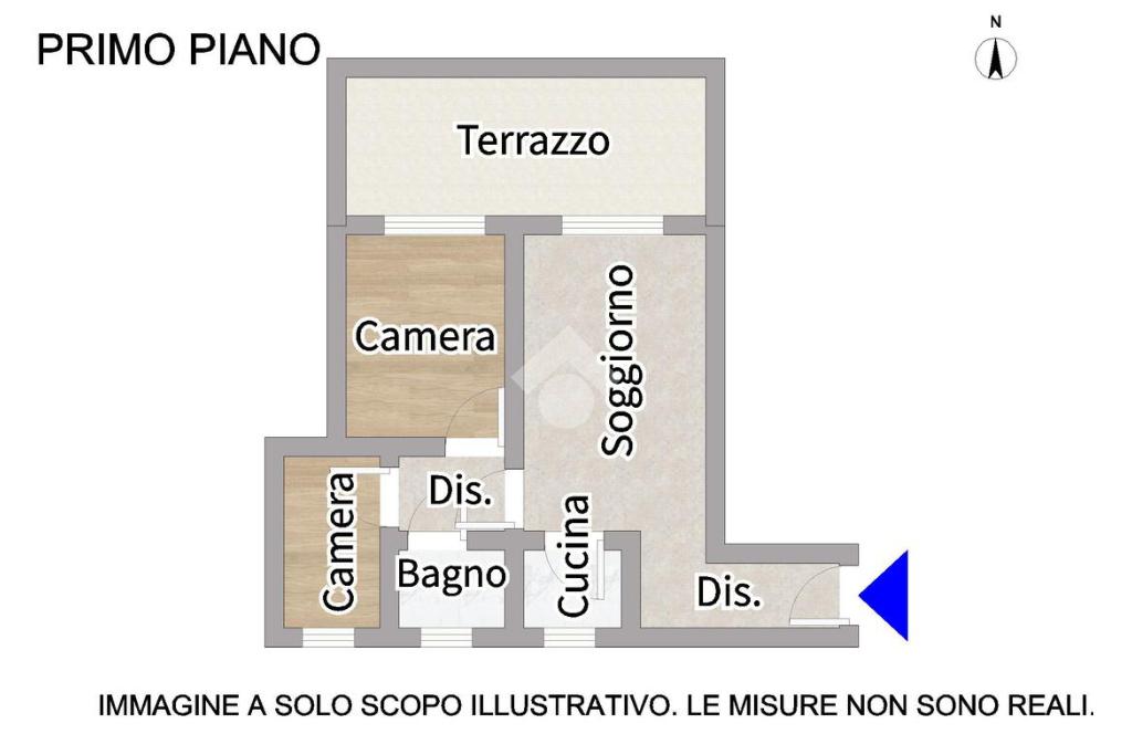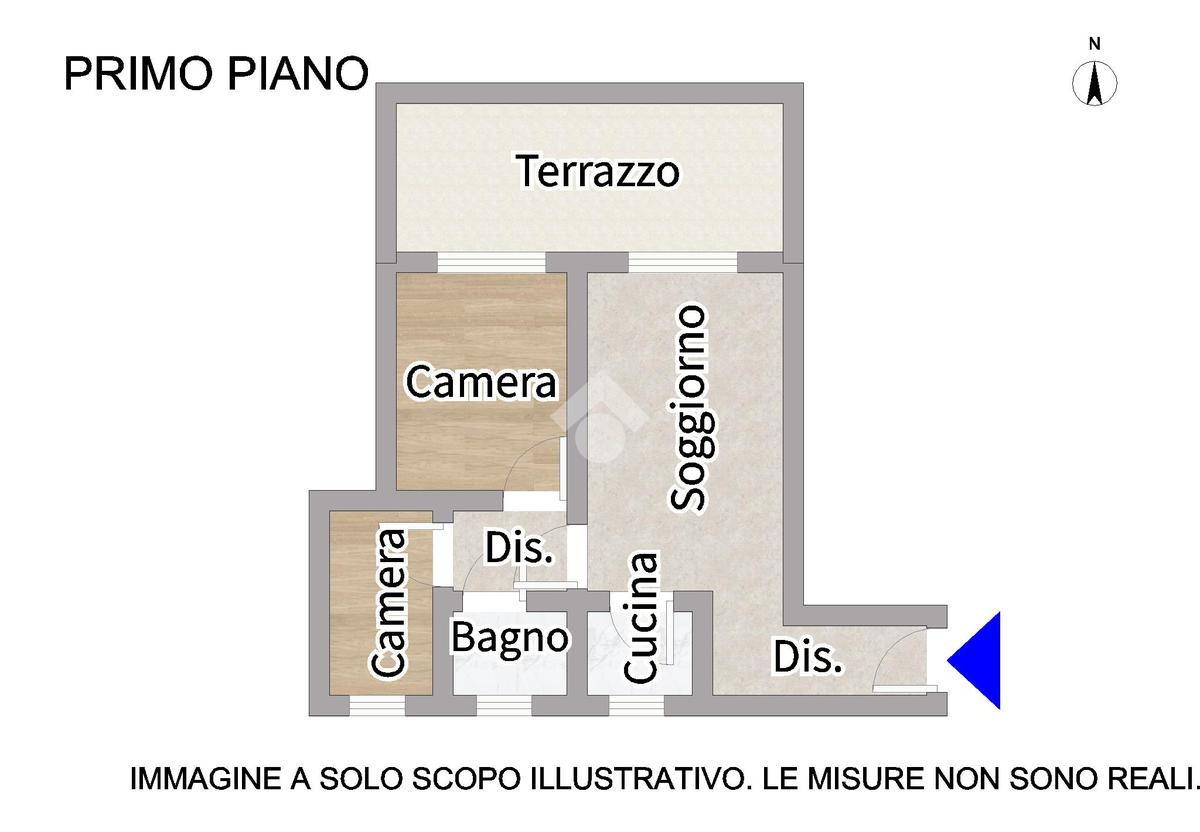 L'appartamento è così composto: ingresso su corridoio, ampio e luminoso soggiorno con primo accesso al terrazzo abitabile; cucina separata, disimpegno, due camere da letto, una matrimoniale e una doppia, ed infine un bagno finestrato con box doccia.